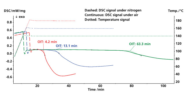 根據氧化誘導期的時間長短可以判斷碳氫化合物的氧化穩(wěn)定性。這些在 DSC 3500 Sirius 上都可以輕易地實現(xiàn)。這里給出了菜籽油樣品在惰性氣氛(N2 氣氛)下,三次升至不同溫度下的測量結果。5 分鐘平衡時間后,氣氛切換成空氣。右圖 DSC 曲線給出了不同測試溫度對樣品氧化裂解的影響。溫度越高,樣品氧化開始的越早:在 140℃ 需要 63min 樣品開始氧化,而在 180℃ 僅需 4min。