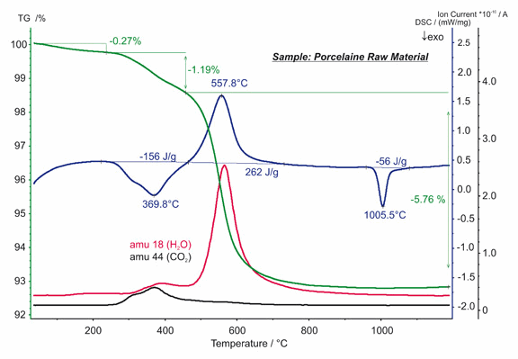 對陶瓷原材料的 STA 測試顯示了三個失重臺階。在約 250°C 以下,為吸附水的揮發(fā)。在 250°C 至 450°C 之間,觀察到了有機(jī)組分的燒失,釋放了 156 J/g 的能量。高嶺土的脫水發(fā)生在 450°C 以上,吸熱熱焓為 262 J/g。質(zhì)譜曲線上的 18 與 44 質(zhì)量數(shù)對應(yīng)于 H2O 與 CO2 的逸出。1006°C 的 DSC 放熱峰(熱焓 -56 J/g)是由于固相轉(zhuǎn)變所致。
