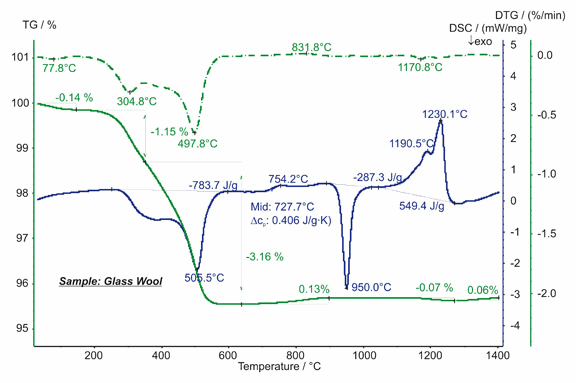 玻璃棉常用作房屋與加熱管道的隔熱材料。STA 測試在約 600°C 以下顯示了三個失重臺階,這些是由于吸附水的揮發(fā)與有機(jī)粘合劑的燒失所致。其中有機(jī)粘合劑的燒失對應(yīng)于該溫度范圍內(nèi)的強(qiáng)烈的 DSC 放熱峰。玻璃化轉(zhuǎn)變在 DSC 曲線上表現(xiàn)為 728°C 附近的臺階,比熱增加 0.41J/(g*K)。950°C 的 DSC 放熱峰對應(yīng)于結(jié)晶效應(yīng),熱焓 -287 J/g;1050°C 至 1250°C 之間的吸熱效應(yīng)對應(yīng)于熔融,總熱焓 549 J/g。700°C 以上的微量的質(zhì)量變化最可能是由于雜質(zhì)的氧化與揮發(fā)所致。