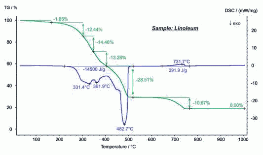 油氈作為一種建筑材料發(fā)明于1863年,常用于樓面覆蓋,具有堅固、絕緣等特點(diǎn)。通過STA在空氣氣氛下的測試,可揭示油氈的自然組成。150°C之前是水分的揮發(fā),隨后的 200°C 至500°C 之間多步的失重主要是亞麻子油、天然樹脂、軟木屑、木屑和黃麻襯底等的燒失,伴隨著較大的放熱效應(yīng),在該氧化過程中釋放的熱量達(dá) 14.5KJ/g。在 600°C…750°C 之間,主要是填充物 CaCO3 的熱分解。