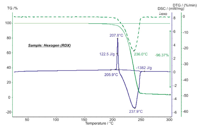 烈性炸藥黑索金(也稱RDX,T4等)在150°C 就開始升華,從熱重曲線即可看出。在DSC曲線上,起始點(diǎn)為206°C的吸熱峰,主要是樣品的熔融,其熱焓值為123J/g。在200°C…250°C之間,有劇烈的放熱現(xiàn)象,并釋放出1.38KJ/g的熱量。該實(shí)驗(yàn)的樣品量為2.32mg,升溫速率為5K/min,氣氛為合成空氣。