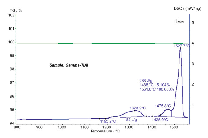 難熔合金 γ-TiAl 可通過高溫和低密度耐腐蝕測試進(jìn)行鑒別。一般用于航空航天領(lǐng)域的渦輪充電器、燃?xì)鉁u輪和發(fā)動機(jī)。圖中 DSC 曲線顯示,在外推起始點(diǎn)溫度 1195°C 時有一吸熱效應(yīng)(峰值溫度為1323°C),主要是 α2 →α 相轉(zhuǎn)變過程。在 1476°C(峰值溫度)時,α 相向 β相轉(zhuǎn)變。DSC曲線上 1528°C 時的吸熱峰主要是樣品的熔融過程(起始點(diǎn)溫度:1490°C,液相線溫度大約 1560°C)。在整個測試過程中,樣品質(zhì)量無明顯變化。
