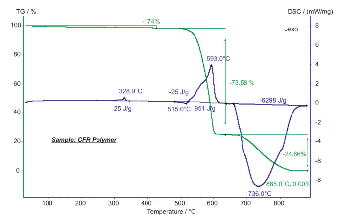 碳纖維增強(qiáng)高聚物(CFRP)是常用的復(fù)合材料。主要由聚合物和嵌入的碳纖維組成,具有質(zhì)量輕、硬度大、穩(wěn)定性強(qiáng)等特點(diǎn),適合汽車、航空航天領(lǐng)域的應(yīng)用。STA 的測試結(jié)果顯示,在 329°C 有一吸熱峰,其熱焓值為 25J/g,主要是聚合物的熔融過程。在大約 480°C…620°C之間主要是聚合物的分解。在 650°C,將氣氛由 N2 切換成 O2,碳纖維組分發(fā)生放熱分解(失重:24.7%)。實(shí)驗(yàn)結(jié)束時的殘余質(zhì)量 0.0% 表明樣品中無其他無機(jī)填充物或者玻璃纖維。