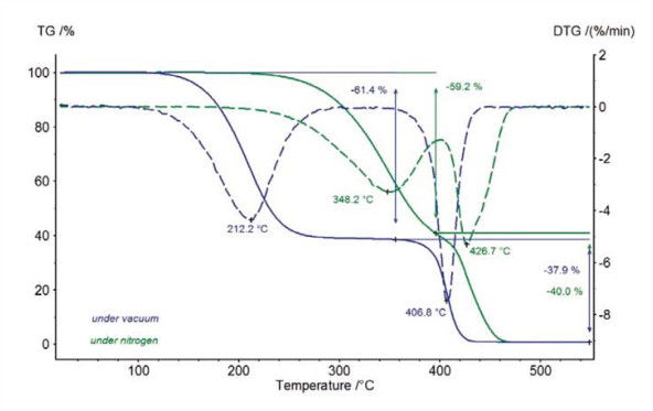 熱塑性彈性體是一類兼有熱塑性和彈性性能的共聚物或共混物,非常容易加工,例如注射成型。在常規(guī)的動態(tài)吹掃氣氛條件下,這類材料中小分子增塑劑的分解臺階與彈性體組分的分解臺階互相重疊,無法分開。當(dāng)在真空下測試時,增塑劑的沸點(diǎn)下降,揮發(fā)提前,其含量的定量測定將更為精確。