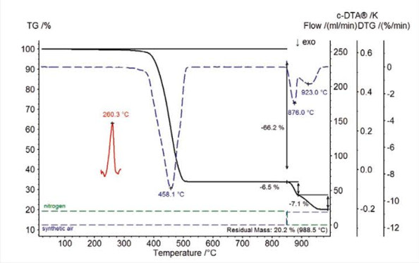 聚酰胺 66(PA66)是一種熱塑性聚合物,廣泛使用于各種工程技術(shù)行業(yè)。通常采用添加適當(dāng)?shù)奶盍?,例如玻璃纖維,以提高 PA66 的剛度。對 PA66 進(jìn)行 TGA 測試不僅可以確定其分解行為,而且還能得到玻璃纖維的含量。下圖中的 TGA 曲線清楚地顯示出裂解碳和填充碳的比例。