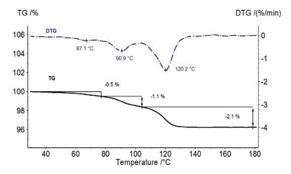 市售的硬脂酸鎂一般由幾種脂肪酸鹽按不同比例混合而成,被廣泛用作藥物的賦形劑。TGA 測試硬脂酸鎂在 200°C 溫度范圍內(nèi)有三個失重臺階:0.5%,1.1% 和 2.1%,若通過 TGA/FTIR 聯(lián)用分析儀,從對應(yīng)的譜圖即可初步判斷這三次失重均為水分的揮發(fā)。