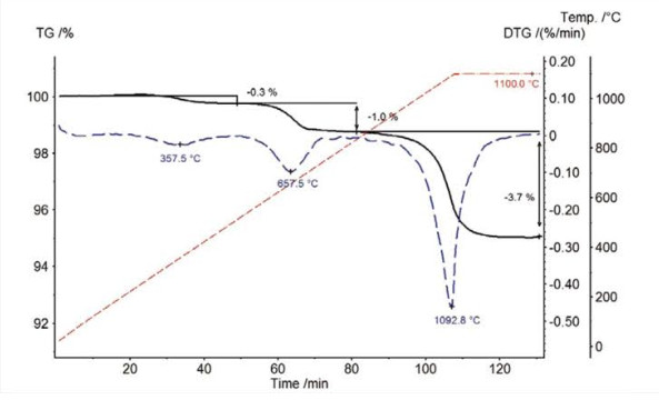 TGA 測試分析顯示出在較低溫度下云母脫水和脫羥基的失重過程。TG 209 F1 Libra™ 配備新型的陶瓷爐體,具有寬廣的溫度測試范圍,最高溫度達(dá) 1100℃,能夠觀察到云母在 1093°C 的特征失重溫度。