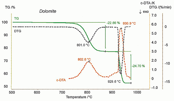 白云石(CaMg(CO3)2)在氮?dú)鈿夥障聹y試,其熱分解的失重臺階之間互相重疊;當(dāng)在 CO2 氣氛下測試,這些分解臺階就會被明顯分開。c-DTA 曲線則給出了進(jìn)一步的信息:這兩步分解均是吸熱分解。