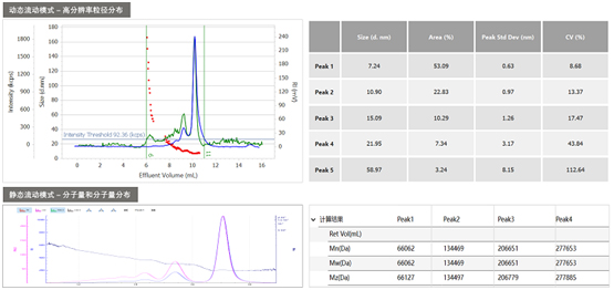 BeNano動(dòng)靜態(tài)流動(dòng)模式(Flow Mode)是將納米粒度及Zeta電位儀同一個(gè)分離前端(FFF、GPC/SEC)相連接。分離前端可以根據(jù)尺寸將樣品進(jìn)行分離,依次流出。通過檢測(cè)每個(gè)流出組分的動(dòng)態(tài)光散射信號(hào)和靜態(tài)光散射號(hào),并結(jié)合分離前端的示差折光RI或者紫外UV信號(hào),得到高分辨率且不依賴于計(jì)算模型的粒徑分布、分子量分布信息。