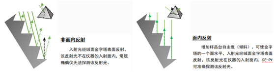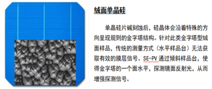 SE-PV獨特的設計可以滿足絨面基底上薄膜的量測需求,如下圖所示的樣品,絨面及其表面增透膜層的設計都是為了降低電池片表面對太陽光的反射,這使得探測信號變?nèi)?,大大增加了光學測量難度。