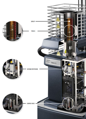 TMA 450采用快速響應(yīng)的小質(zhì)量加熱爐,提供從-150℃至1000℃范圍內(nèi)最精確的溫度控制,和0.01至150°C/min的穩(wěn)定升溫速率。該加熱爐確保了精確尺寸變化測(cè)量所需的優(yōu)異基線性能,以及調(diào)制TMA™測(cè)試所需的動(dòng)態(tài)溫度控制。空氣冷卻功能將實(shí)驗(yàn)周轉(zhuǎn)時(shí)間縮短為10分鐘,顯著提高實(shí)驗(yàn)室生產(chǎn)率。加熱爐頂部的集成式Inconel®718杜瓦槽可加入液氮將其冷卻至-150℃,或者可將該儀器與選配的無(wú)液氮機(jī)械制冷附件(MCA 70)相連,以將加熱爐冷卻至-70 ℃。除了提供更寬的溫度范圍,制冷附件還提供執(zhí)行升溫/降溫?zé)嵫h(huán)實(shí)驗(yàn)的能力,以及進(jìn)一步縮短實(shí)驗(yàn)周轉(zhuǎn)時(shí)間。