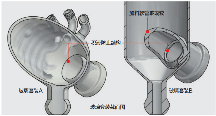 為了防止冷凝管內(nèi)的冷凝液通過加料軟管回流到蒸餾燒瓶,在冷凝管內(nèi)設(shè)計(jì)了加料軟管玻璃套。玻璃套從外部將試料軟管包裹住,成功實(shí)現(xiàn)了在玻璃管內(nèi)部,再搭配玻璃套的復(fù)雜結(jié)構(gòu)。